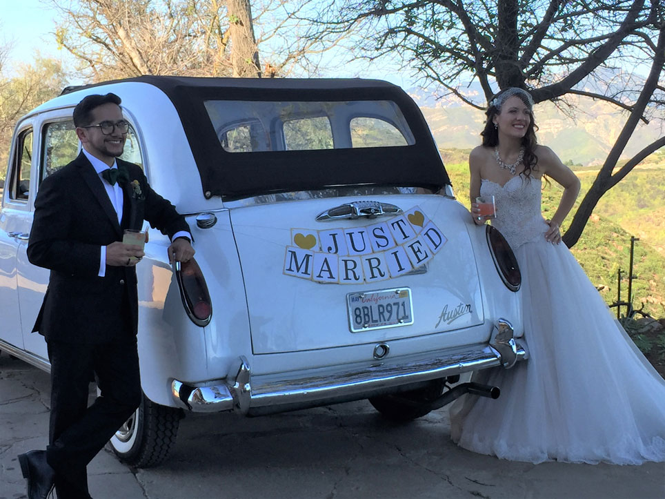 Newly married couple taking a picture from the back of a London Taxi cab.